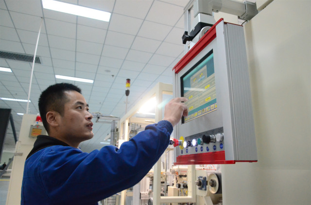 圖為李磊在工作崗位操作全自動進口設(shè)備的情形。