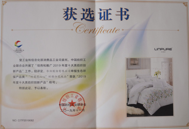 近日,中國紡織工業聯合會受工業和信息化部消費品工業司委托,開展了“培育和推廣2019年度十大類紡織創新新品”工作,公司的“天然抗菌漢麻超柔床品”、“竹韻花沁心環保印花床品”榮獲“2019年度十大類紡織創新床品”稱號。
