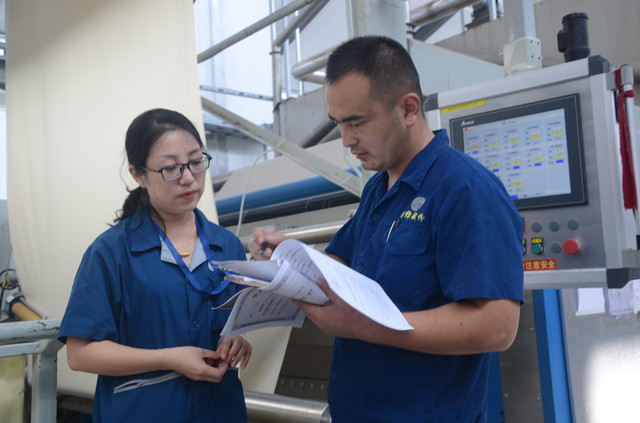 圖為巡查人員盧敏捷(左)在與家紡車間340水洗機擋車工李正(右)落實、核對該機臺的維修及運行數據。