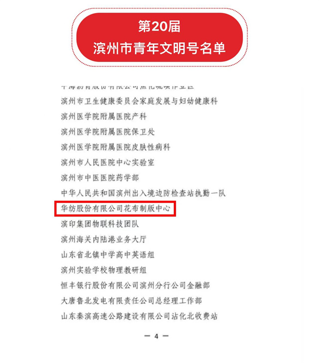 導(dǎo)讀:11月8日,濱州市創(chuàng)建青年文明號(hào)活動(dòng)組委會(huì)發(fā)布《關(guān)于命名第20屆“濱州市青年文明號(hào)”的決定》,經(jīng)逐級(jí)認(rèn)定、嚴(yán)格審核、社會(huì)公示,公司花布制版中心獲第20屆“濱州市青年文明號(hào)”