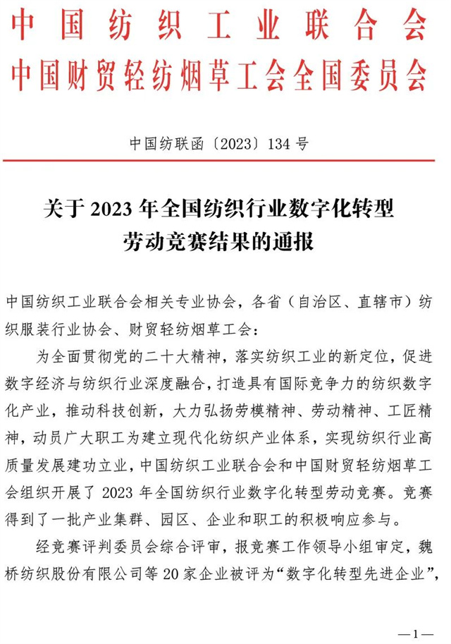 導(dǎo)讀:近日,中國紡織工業(yè)聯(lián)合會、中國財(cái)貿(mào)輕紡煙草工會全國委員會聯(lián)合發(fā)布了《關(guān)于2023年全國紡織行業(yè)數(shù)字化轉(zhuǎn)型勞動競賽結(jié)果的通報(bào)》,