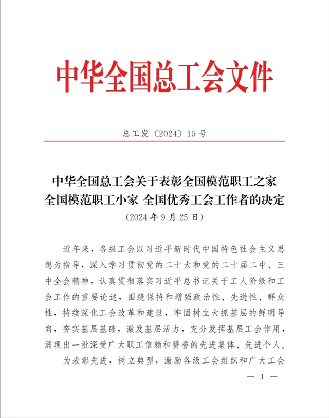 “全國模范職工之家”是中華全國總工會(huì)設(shè)立的授予全國工會(huì)系統(tǒng)先進(jìn)集體的最高榮譽(yù),是對基層工會(huì)工作的最高褒獎(jiǎng)和肯定。公司工會(huì)在公司黨委領(lǐng)導(dǎo)下,以習(xí)近平新時(shí)代中國特色社會(huì)主義思想為指導(dǎo),深入學(xué)習(xí)貫徹黨的二十大和黨的二十屆二中、三中全會(huì)精神,認(rèn)真貫徹落實(shí)習(xí)近平總書記關(guān)于工人階級和工會(huì)工作的重要論述,牢固把握正確政治方向,充分發(fā)揮橋梁紐帶作用,切實(shí)維護(hù)職工合法權(quán)益,努力構(gòu)建和諧勞動(dòng)關(guān)系,不斷增強(qiáng)工會(huì)組織的引領(lǐng)力、組織力、服務(wù)力,為公司高質(zhì)量發(fā)展貢獻(xiàn)工會(huì)智慧和力量。