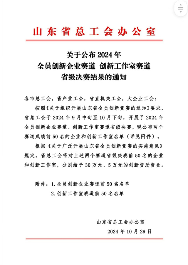 近日,山東省總工會公布了2024年全員創新企業賽道、創新工作室賽道名單,在全員創新企業賽道,公司成功入選!