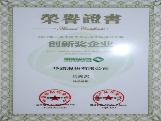 日前,由中國(guó)紡織工業(yè)聯(lián)合會(huì)主辦的中國(guó)國(guó)際面料設(shè)計(jì)大賽、中國(guó)生態(tài)環(huán)保面料設(shè)計(jì)大賽活動(dòng)圓滿(mǎn)結(jié)束,公司在大賽中取得可喜成績(jī),分別榮獲“2018/2019秋冬中國(guó)流行面料入圍企業(yè)”、“2017第二屆中國(guó)生態(tài)環(huán)保面料創(chuàng)新企業(yè)”榮譽(yù)稱(chēng)號(hào)。