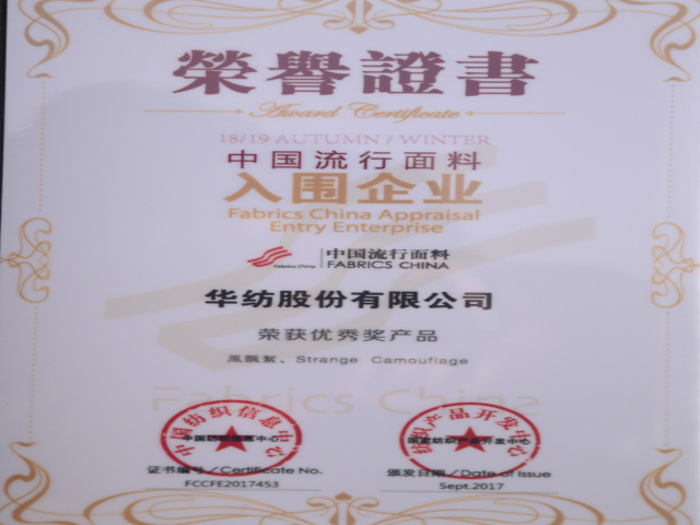 在參評(píng)的設(shè)計(jì)作品方面,由公司員工席亞偉設(shè)計(jì)開(kāi)發(fā)的“風(fēng)飄絮”、孟鑫設(shè)計(jì)的“Strange Camouflage”產(chǎn)品,榮獲“2018/2019秋冬中國(guó)流行面料入圍評(píng)審優(yōu)秀獎(jiǎng)”;孟鑫設(shè)計(jì)的“唯美倩影”作品,榮獲“2017第二屆中國(guó)生態(tài)環(huán)保面料設(shè)計(jì)大賽優(yōu)秀獎(jiǎng)”。